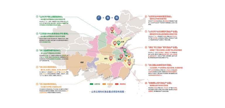 商達(dá)公用集團(tuán)在RAS循環(huán)水養(yǎng)殖領(lǐng)域依托專業(yè)的運(yùn)營(yíng)公司——山東公用設(shè)施漁業(yè)有限公司,采用Sound5.0未來(lái)漁工廠和“廠+倉(cāng)+優(yōu)”產(chǎn)業(yè)布局。十四五期間規(guī)劃投資建設(shè)運(yùn)營(yíng)高標(biāo)準(zhǔn)工廠化養(yǎng)殖水體100萬(wàn)立方,預(yù)計(jì)產(chǎn)能8萬(wàn)噸/年。目前已在運(yùn)營(yíng)和規(guī)劃的項(xiàng)目包括濟(jì)寧微山湖超級(jí)漁倉(cāng)項(xiàng)目、江蘇宜興評(píng)價(jià)基地、浙江嘉善西塘共富漁倉(cāng)、浙江長(zhǎng)興智慧漁谷、浙江臨安智慧漁谷等多個(gè)EOD和設(shè)施漁業(yè)項(xiàng)目。